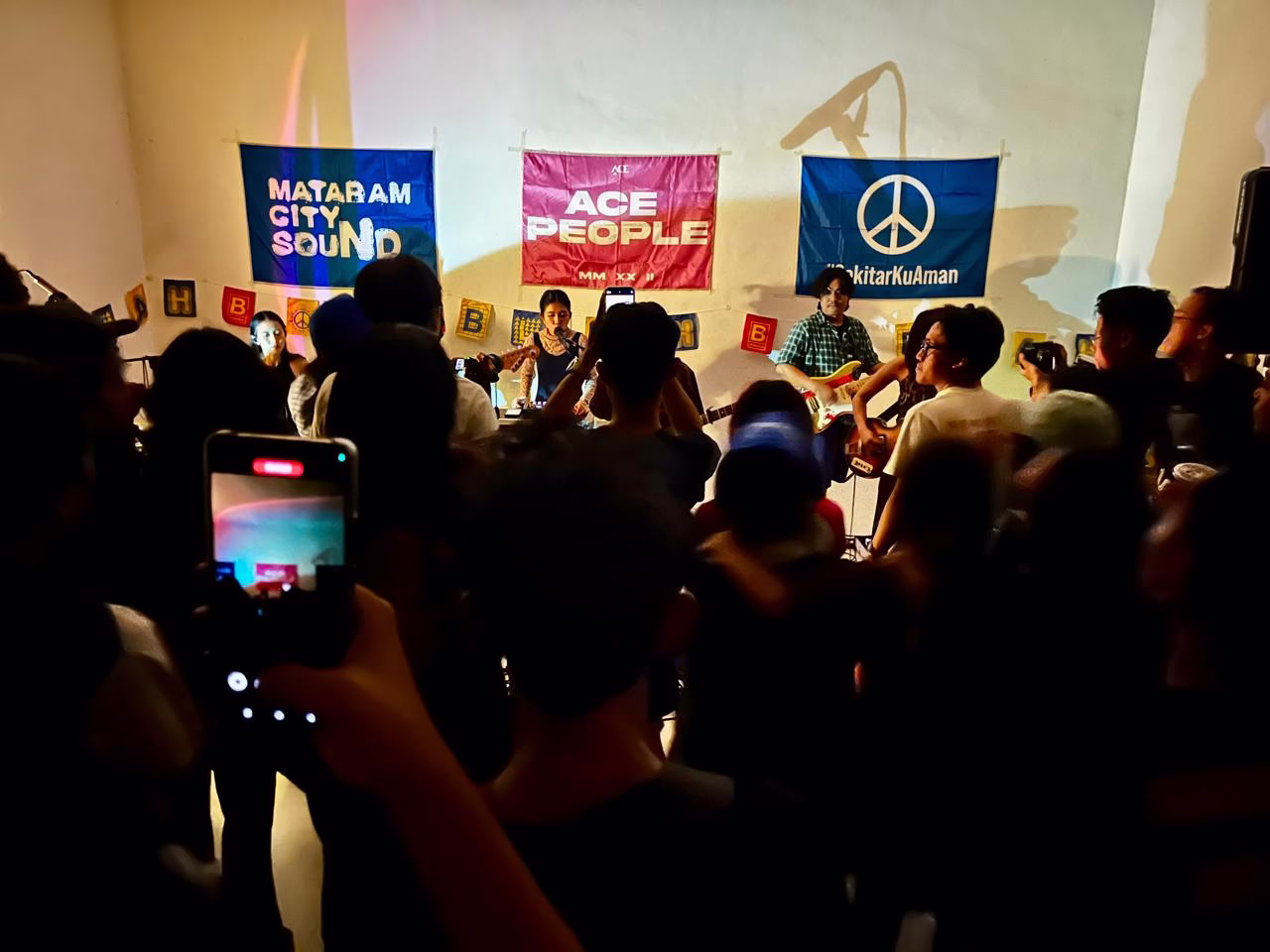 Di dalam ruangan, tiga spanduk membentang di balik panggung: “Mataram City Sound,” “ACE People,” dan “#SekitarKuAman.”